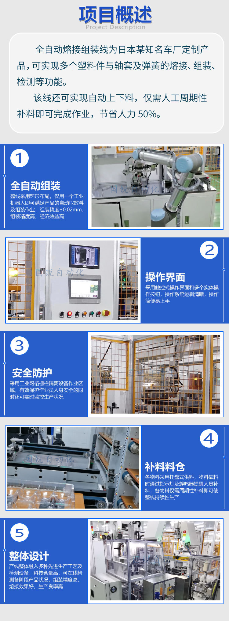 全自動熔接組裝線為日本某知名車廠定制產(chǎn)品,可實(shí)現(xiàn)多個塑料件與軸套和彈簧的熔接、組裝、檢測等功能。該線還可實(shí)現(xiàn)自動上下料,僅需人工周期性補(bǔ)料即可完成作業(yè),節(jié)省人力50%。
